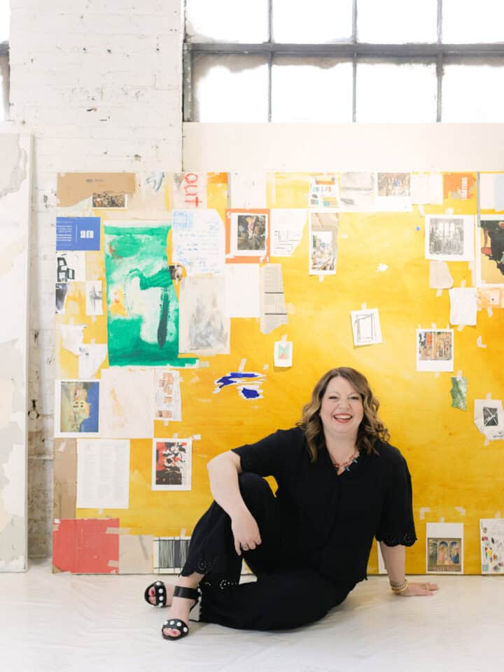 Smiling woman in black outfit at Kristen McGee Interiors conference.