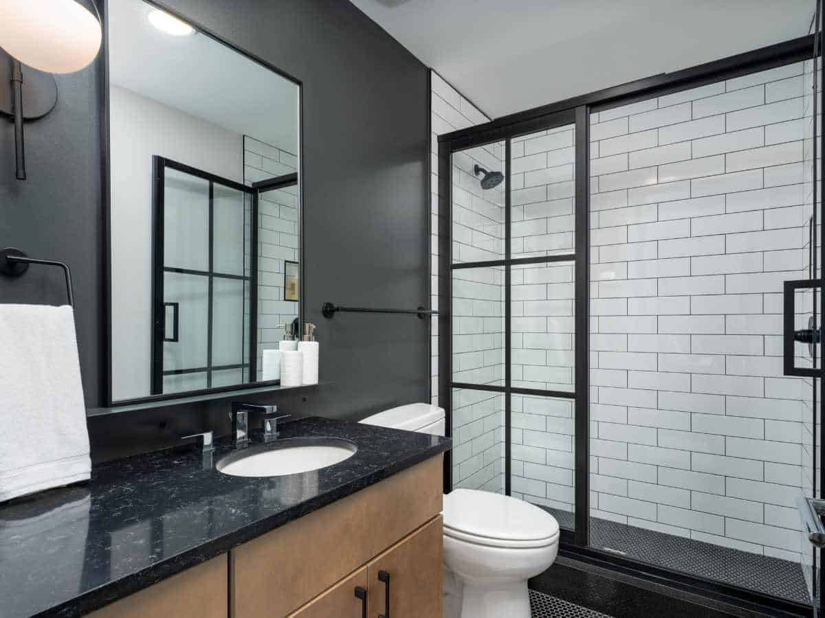 Modern Birmingham short-term rental bathroom with vanity and bedroom view.
