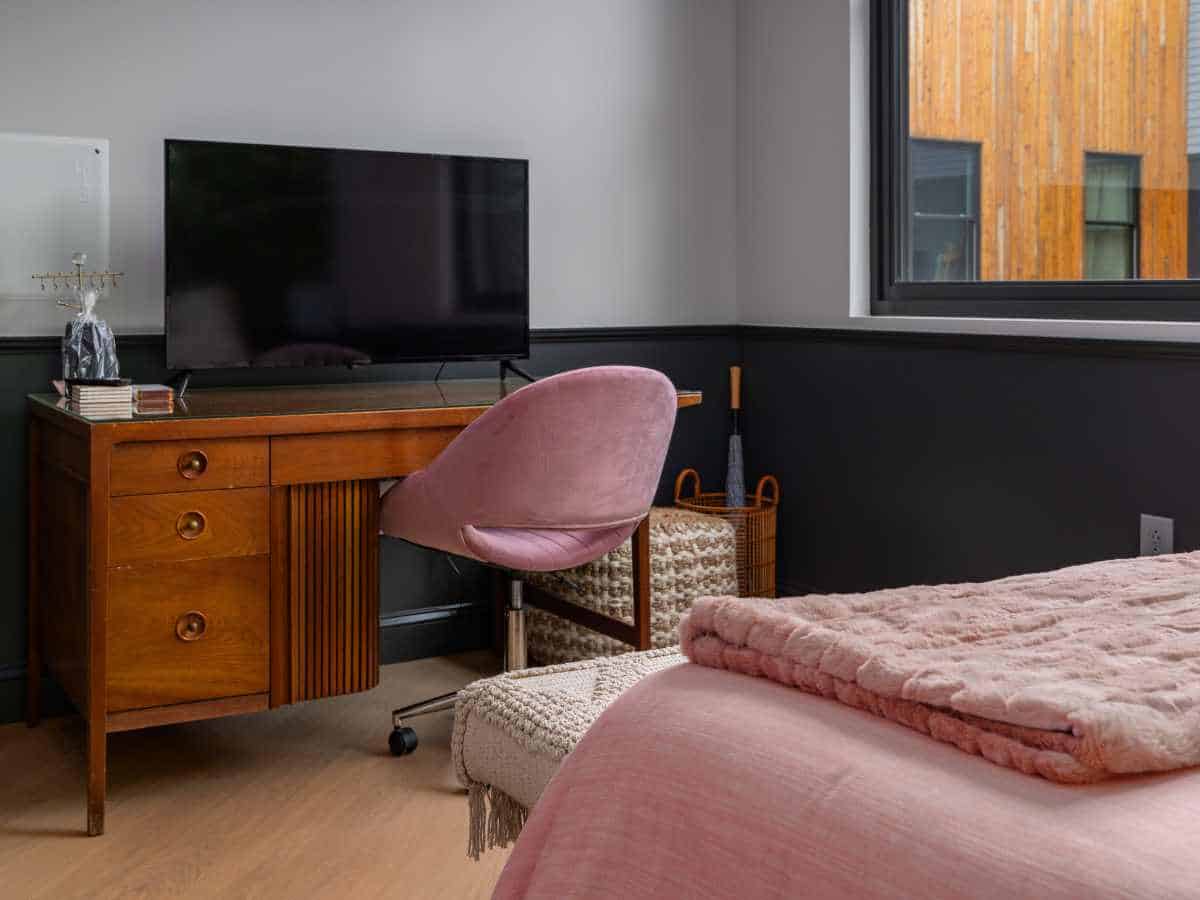 • A custom desk that also functioned as a TV stand, maximizing utility in a compact studio.